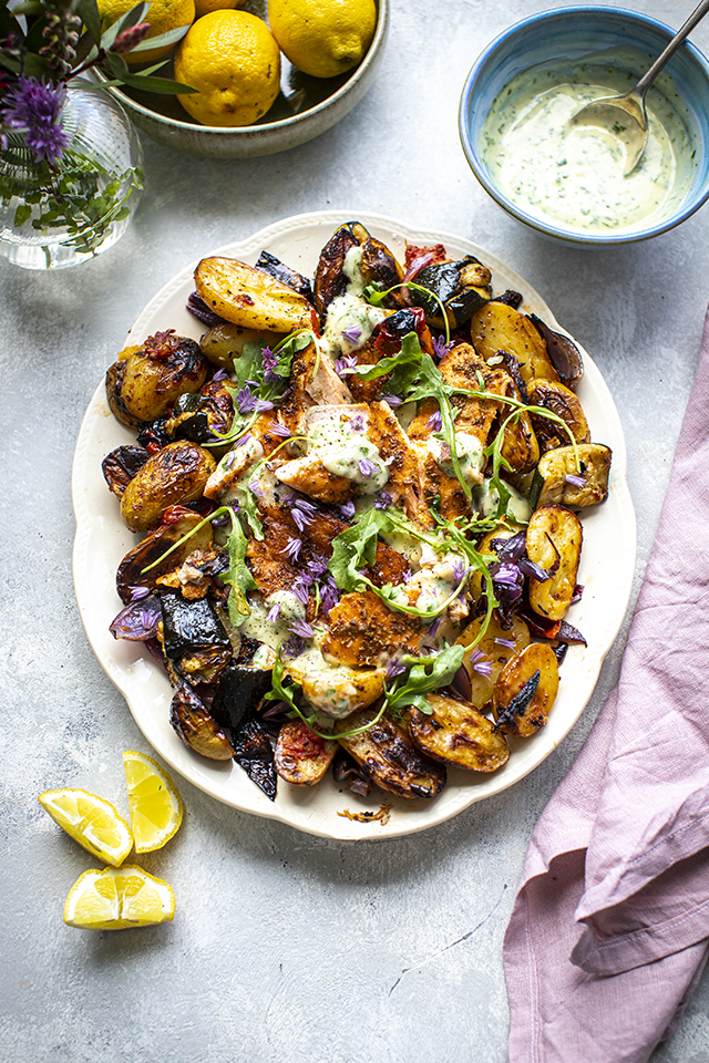 Wood-Fired Fennel Salmon with Roasted Veg and Lemon Aioli