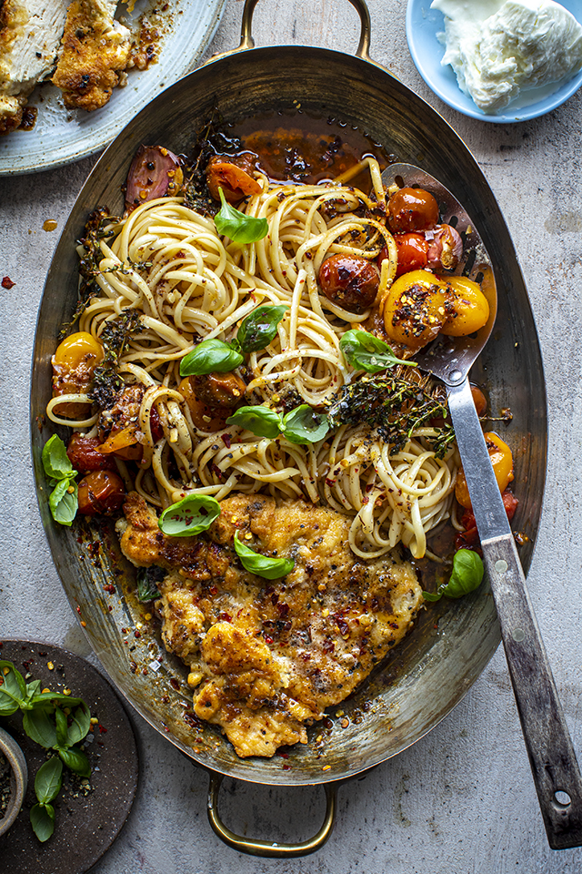 Next, we go full trattoria with Florentine Butter Chicken with Burst Cherry Tomatoes, Basil & Mozzarella. The chicken is flattened, dredged in flour and fried. It’s fried in butter (yes, real butter, and lots of it), and spoon-basted for that deep, golden edge. The tomatoes blister in the same pan, creating the sort of sauce that doesn’t need a jar label. Finished with torn mozzarella and basil, it’s a fast dinner that looks fancy. And pro tip: toss the hot linguine in that buttery tomato mess before plating,  it’ll cling to the pasta and make you look like you’re a pro-cook.