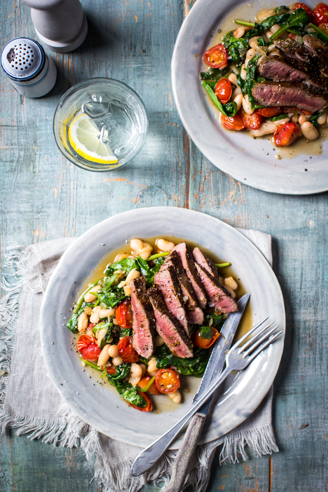 We start strong with Rosemary Lamb Steaks with Quick Bean Stew. This is a recipe I return to when I need a dinner that comes together in minutes. It’s reliable, it’s fast, and it’s all done in one pan. Thin lamb shoulder or leg steaks are quickly marinated in olive oil, garlic and rosemary before hitting a hot pan. But the clever part is what happens next: the same pan becomes home to cherry tomatoes, cannellini beans and spinach, making something between a stew and a sauce. It’s the kind of plate that delivers simple results.